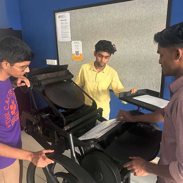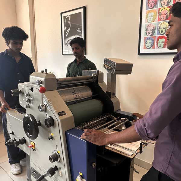 Our Print Lab has facilities for Offset printing, Letterpress printing, Screen printing, Sublimation printing, Lamination, Binding and Digital cutting. A variety of paper is available here and students are often found taking their prints for their assignments. A Hollander beater kept nearby converts used paper from office and classrooms sustainably into elegant handmade paper, which is used in the Print lab for various projects.