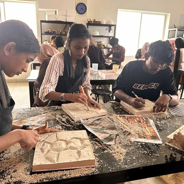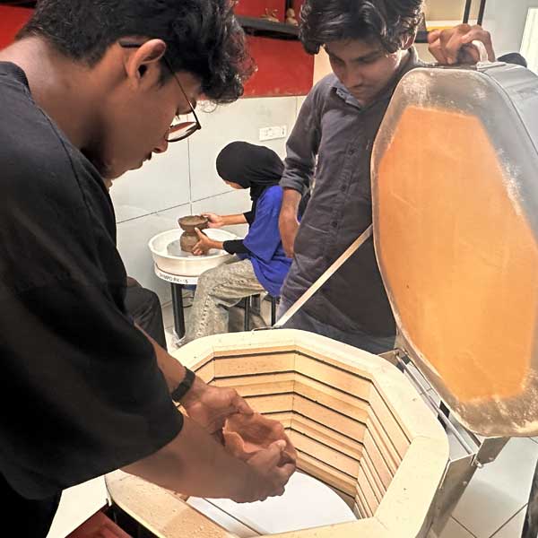 Our Clay lab has an automated turn table and and Electric Kiln to make Terracotta and Ceramic objet d’arts. Students and faculty are found experimenting with materials, forms and finishes here.